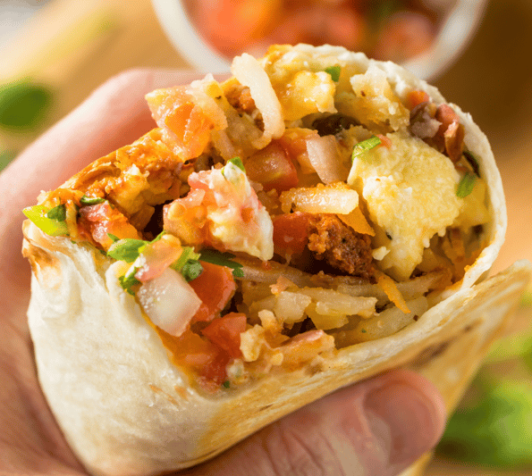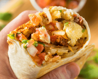 Add a bit more cooking spray to the pan, then move mixture to the side. Add eggs and scramble about 2 minutes. Season to taste with salt. Transfer the mixture to a bowl and cover.Assemble the burrito: